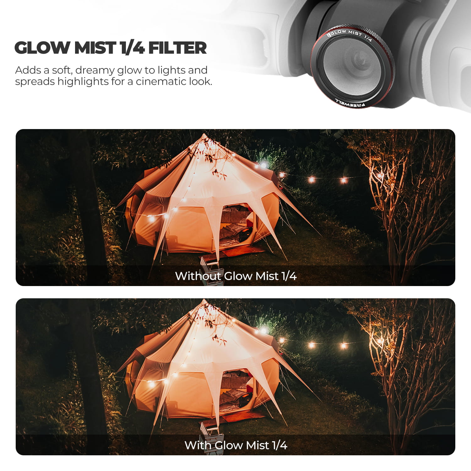 The Glow Mist 1/4 filter introduces a soft cinematic haze to your footage, ideal for storytelling, portrait shots, or dreamy landscape captures.