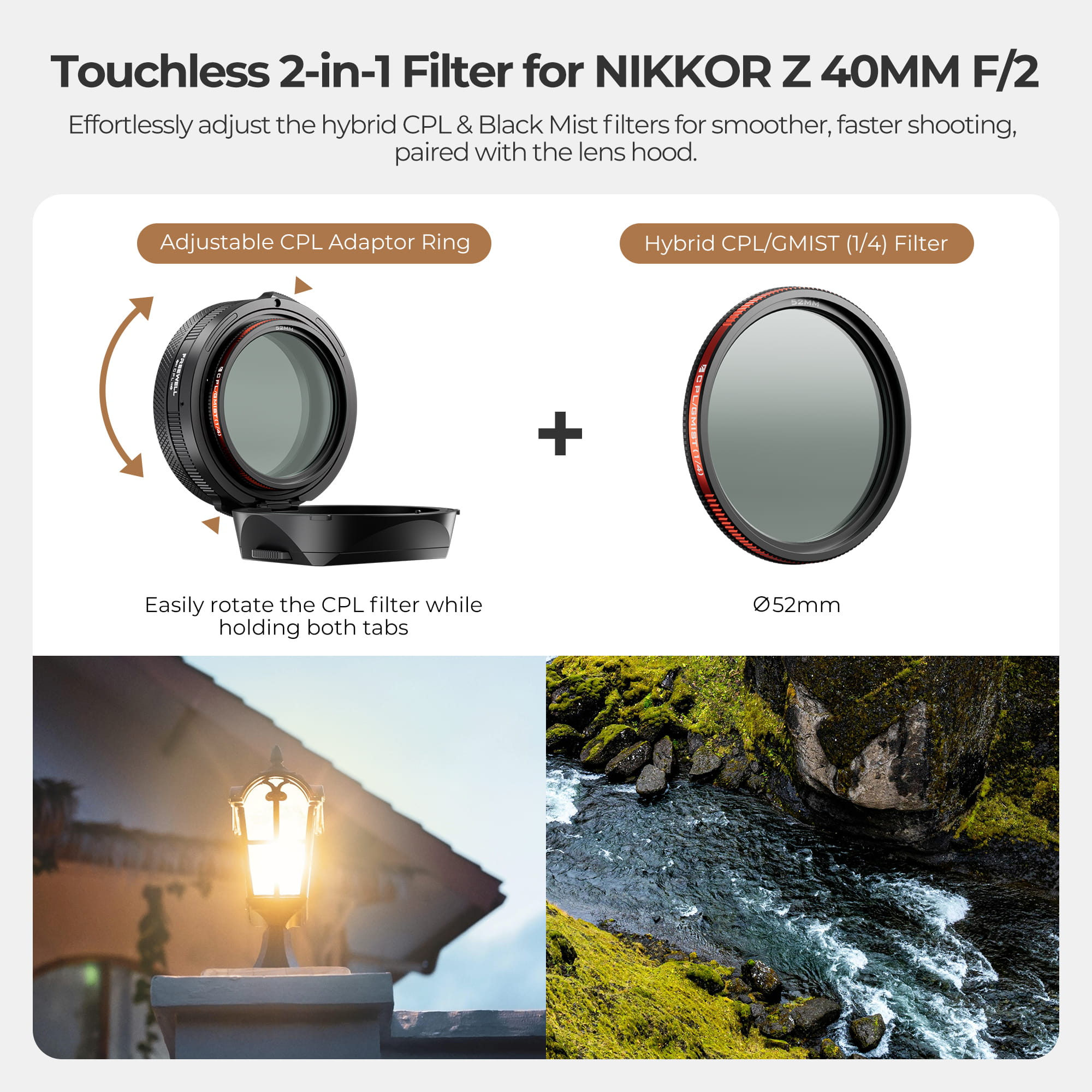 With both effects combined into a single filter that works seamlessly with the touchless adjustment system, you gain powerful creative control without carrying multiple accessories.