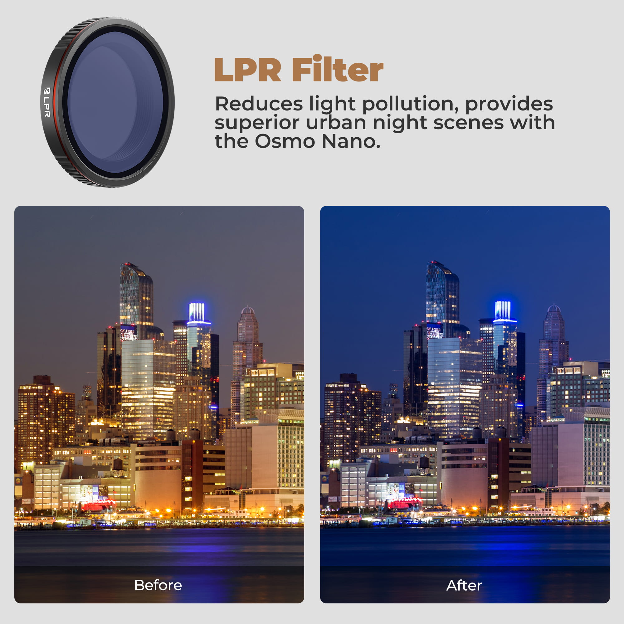 Per i fotografi e videomaker che lavorano di notte, le luci artificiali possono compromettere la registrazione del cielo stellato o dei paesaggi urbani. Il filtro LPR (Light Pollution Reduction) per DJI Osmo Nano aiuta a ridurre l'inquinamento luminoso proveniente da lampioni, fari e altre fonti di luce artificiale, consentendo di ottenere riprese notturne più nitide e precise.