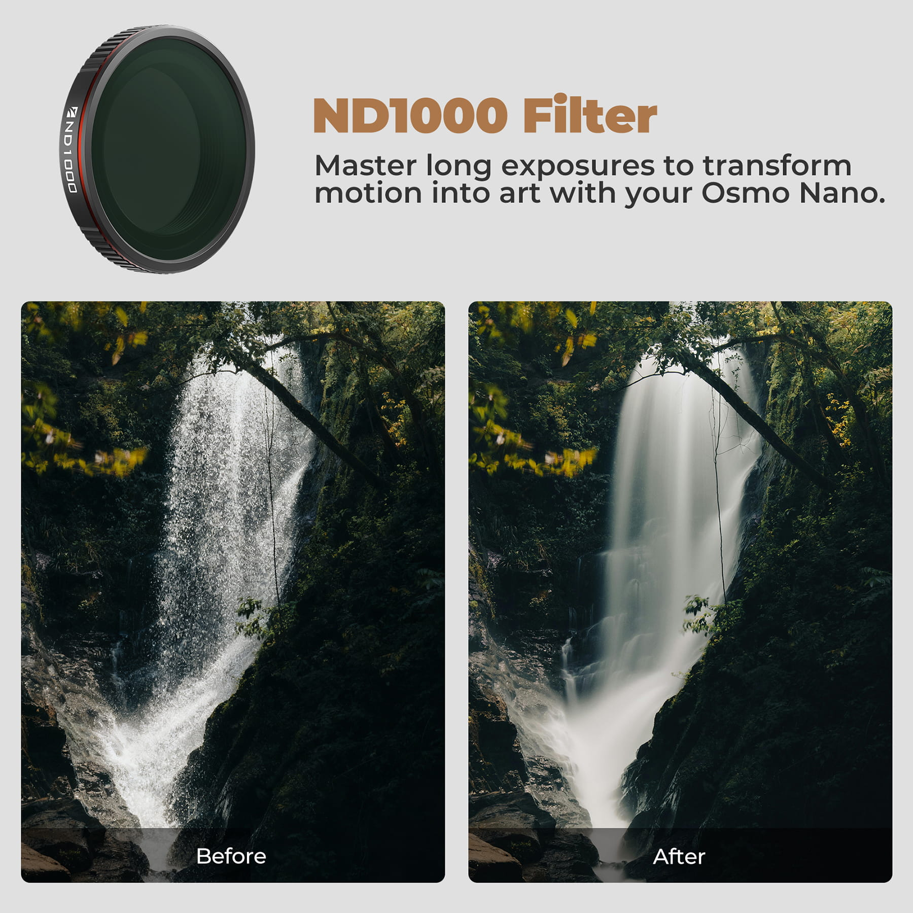 Se ami le lunghe esposizioni, il filtro ND1000 per DJI Osmo Nano è un'ottima scelta. Questo filtro consente di ridurre la luce in ingresso di 10 stop, permettendo di creare effetti di movimento morbido e di lunga esposizione in situazioni di alta luminosità.
