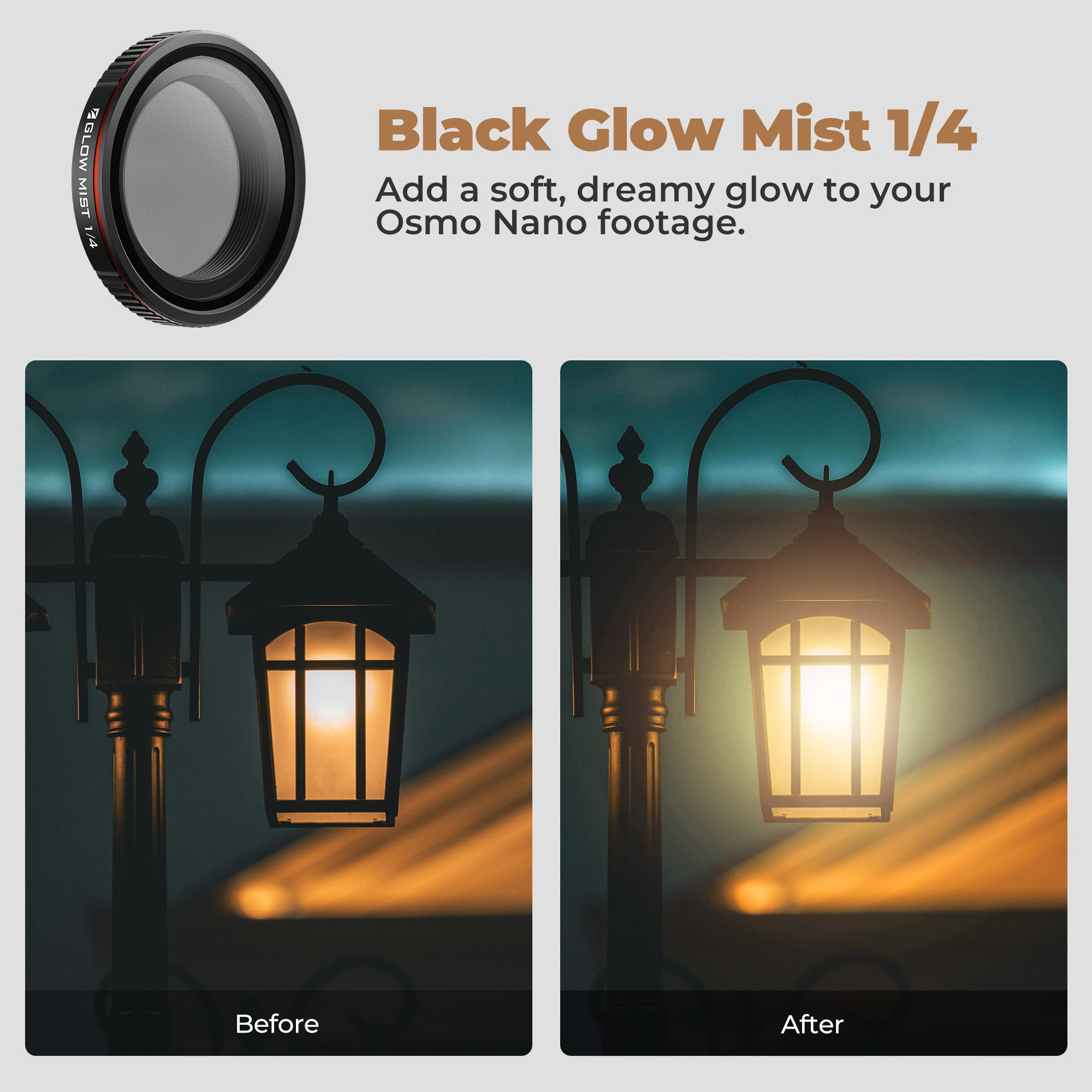 Il filtro Glow Mist 1/4 per DJI Osmo Nano è perfetto per aggiungere un tocco cinematografico alle tue riprese, creando una leggera luminescenza nelle aree luminose. È ideale per riprese a bassa luminosità, in cui aiuta a creare un'atmosfera onirica e artistica sfocando delicatamente le luci intense.