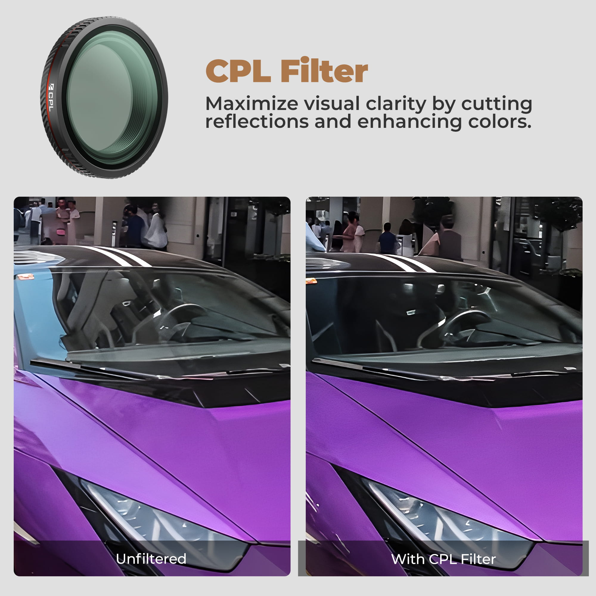 Controle de reflexos: Este filtro minimiza reflexos de superfícies brilhantes, como vidro, água ou estradas molhadas.