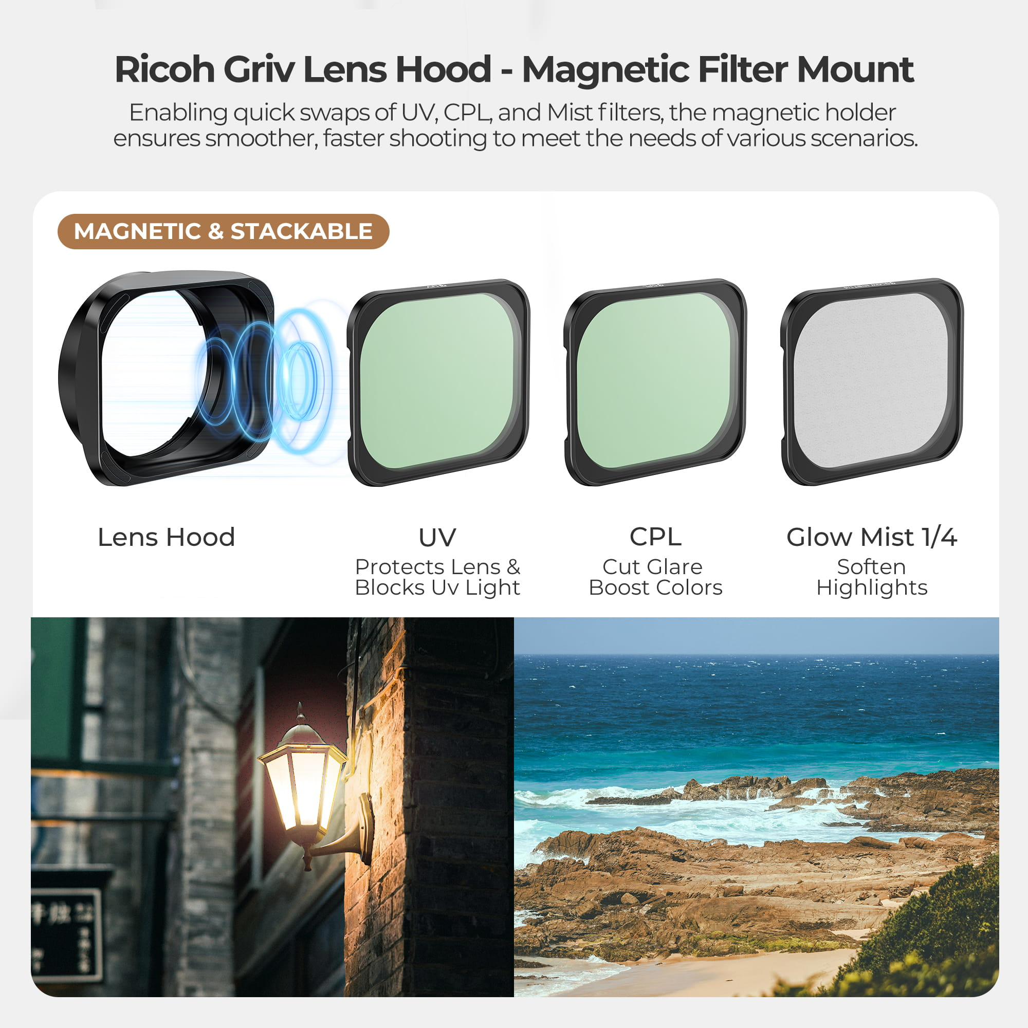 Um dos principais benefícios do parasol é a compatibilidade com filtros magnéticos CPL, UV e Glow Mist 1/4. Esses filtros podem ser aplicados e empilhados facilmente, permitindo combinar múltiplos efeitos em uma única foto. O sistema magnético facilita a troca de filtros e evita desalinhamentos, oferecendo liberdade criativa.