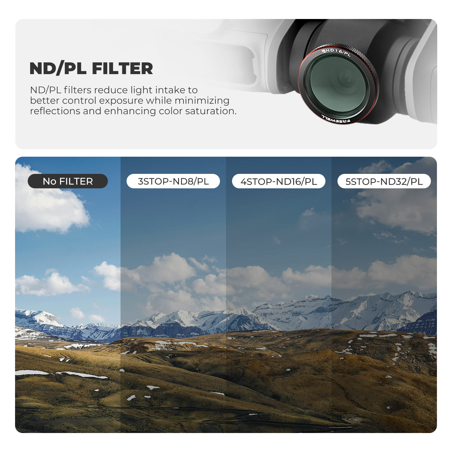 ND 滤镜(ND8、ND16、ND32): 控制曝光与运动模糊,适合各种日间光照条件。